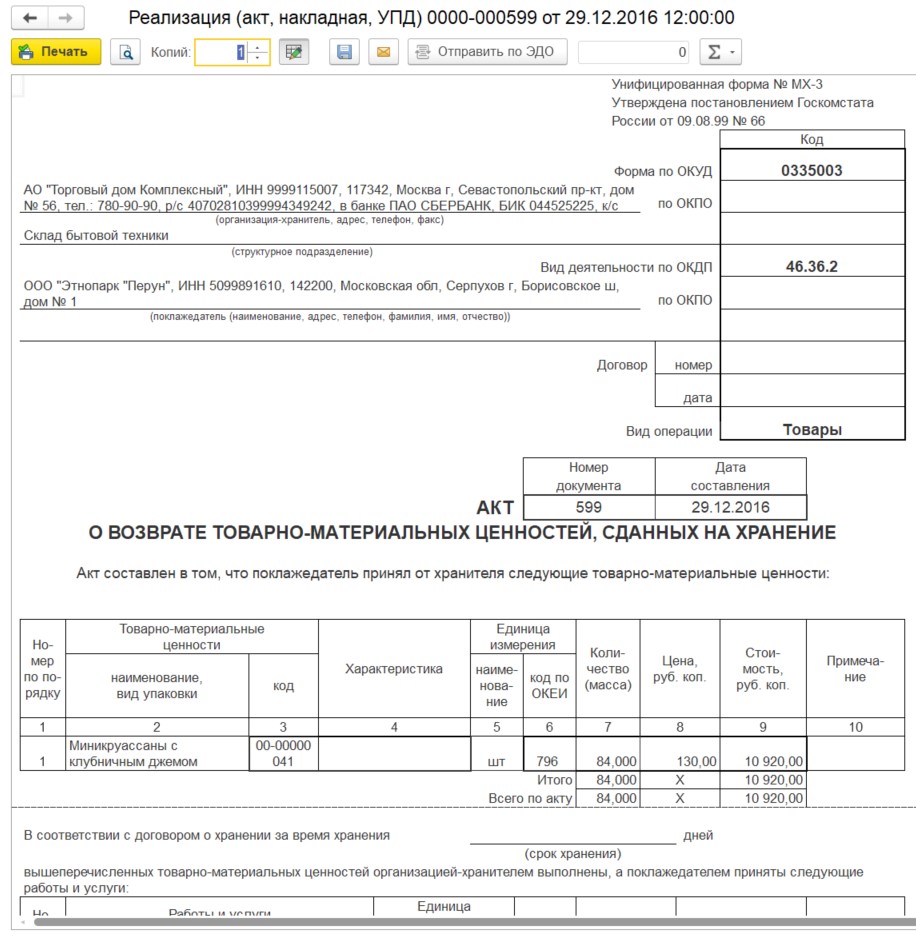Для перемещений система сама определит склад-хранитель и подставит актуальные цены именно на нем на дату операции. Для реализаций — возьмет суммы прямо из вашего документа. А поле «Сдал» будет автоматически заполнено данными материально-ответственного лица с того склада, откуда возвращается товар.