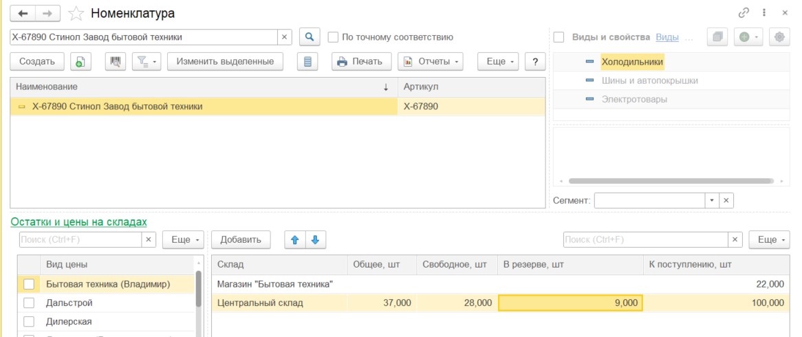 Значения в табличной части складских остатков отображаются в соответствии с выбранной номенклатурой. Меняя выбранную строку в списке номенклатуры — меняются значения в табличной части. В таблице видов цен можно установить галочки напротив тех видов цены, которые необходимо выводить в табличной части остатков номенклатуры. Для каждого пользователя отображается только разрешенные списки видов цен и складов.