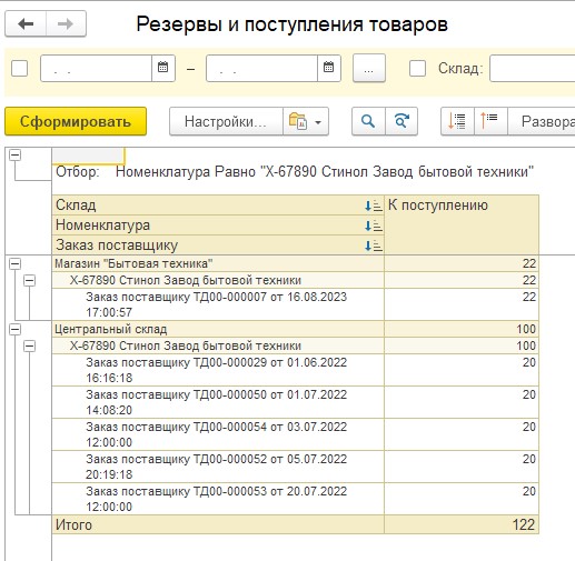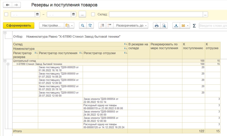 Двойным щелчком на значениях в колонках «В резерве» или «К поступлению» можно открыть отчеты со списком всех документов, по которым выбранная номенклатура находится в резерве или планируется к поступлению. Для просмотра отчета есть роли, которые необходимо предоставить пользователям, планирующим пользоваться отчетами и отображением цен и остатков. В зависимости от роли, данной пользователю, из табличной части откроется отчет «Резервы и поступления товаров» в полноценном виде, либо только товары в резерве и к отгрузке, либо товары к поступлению.